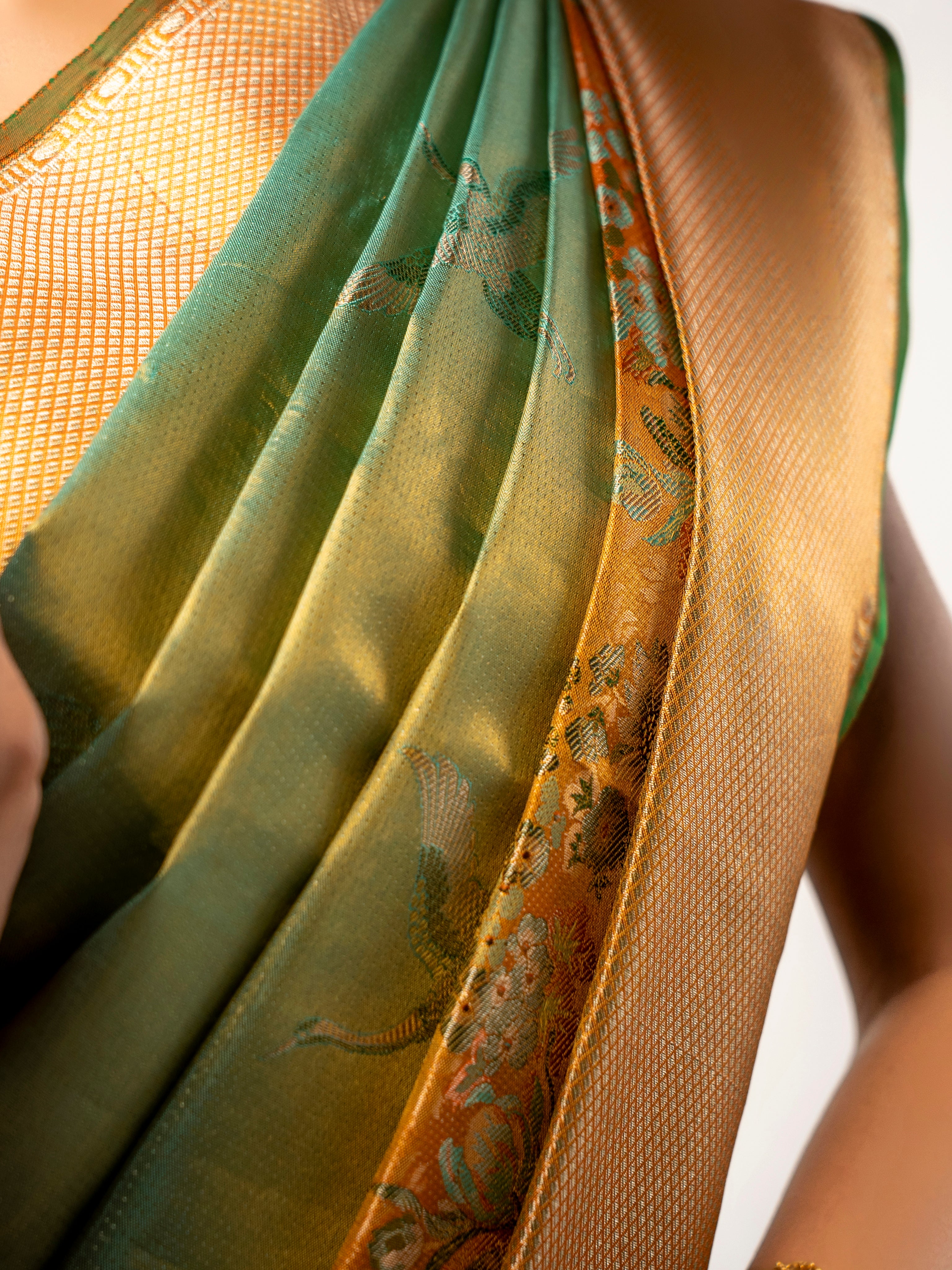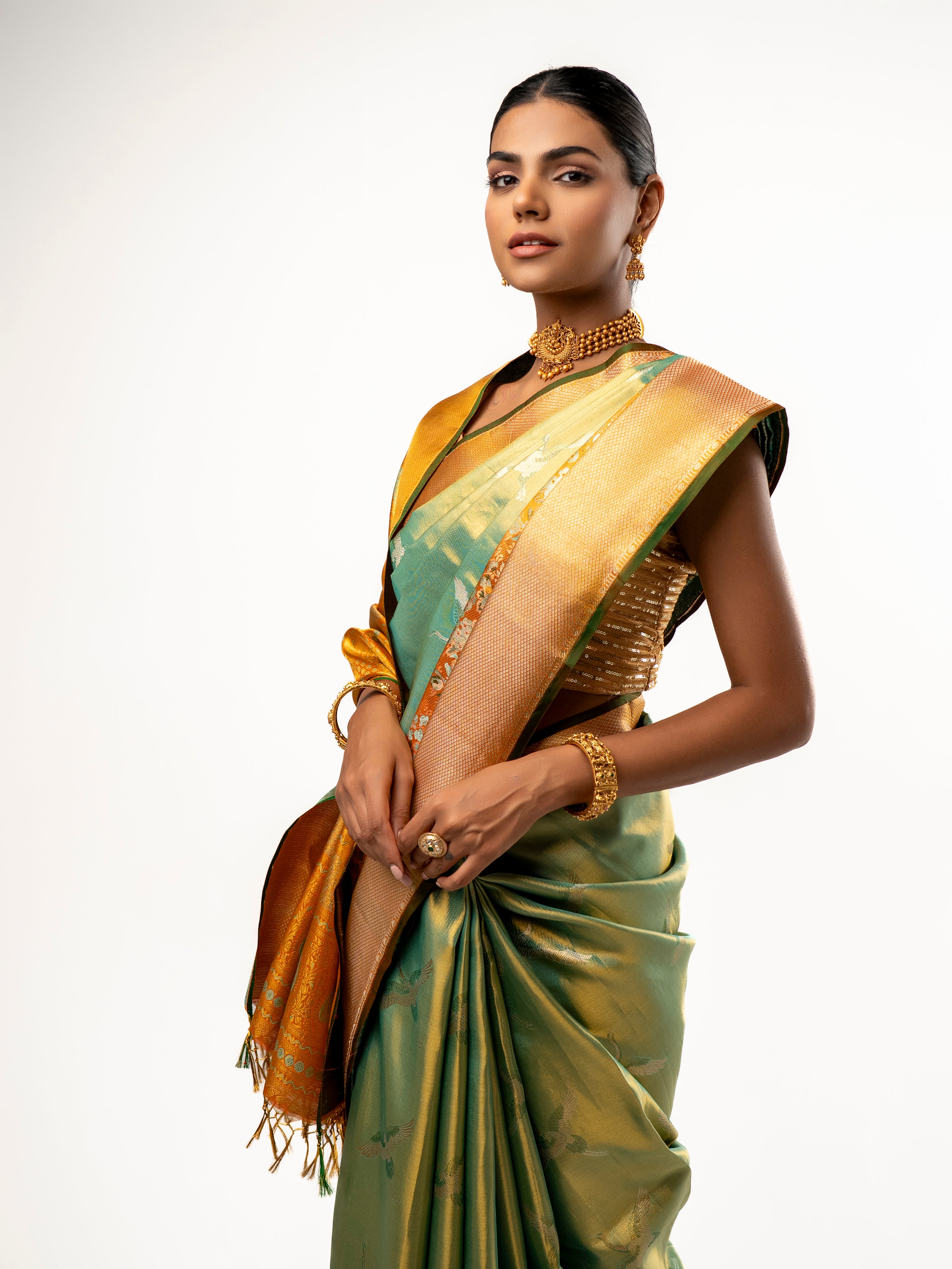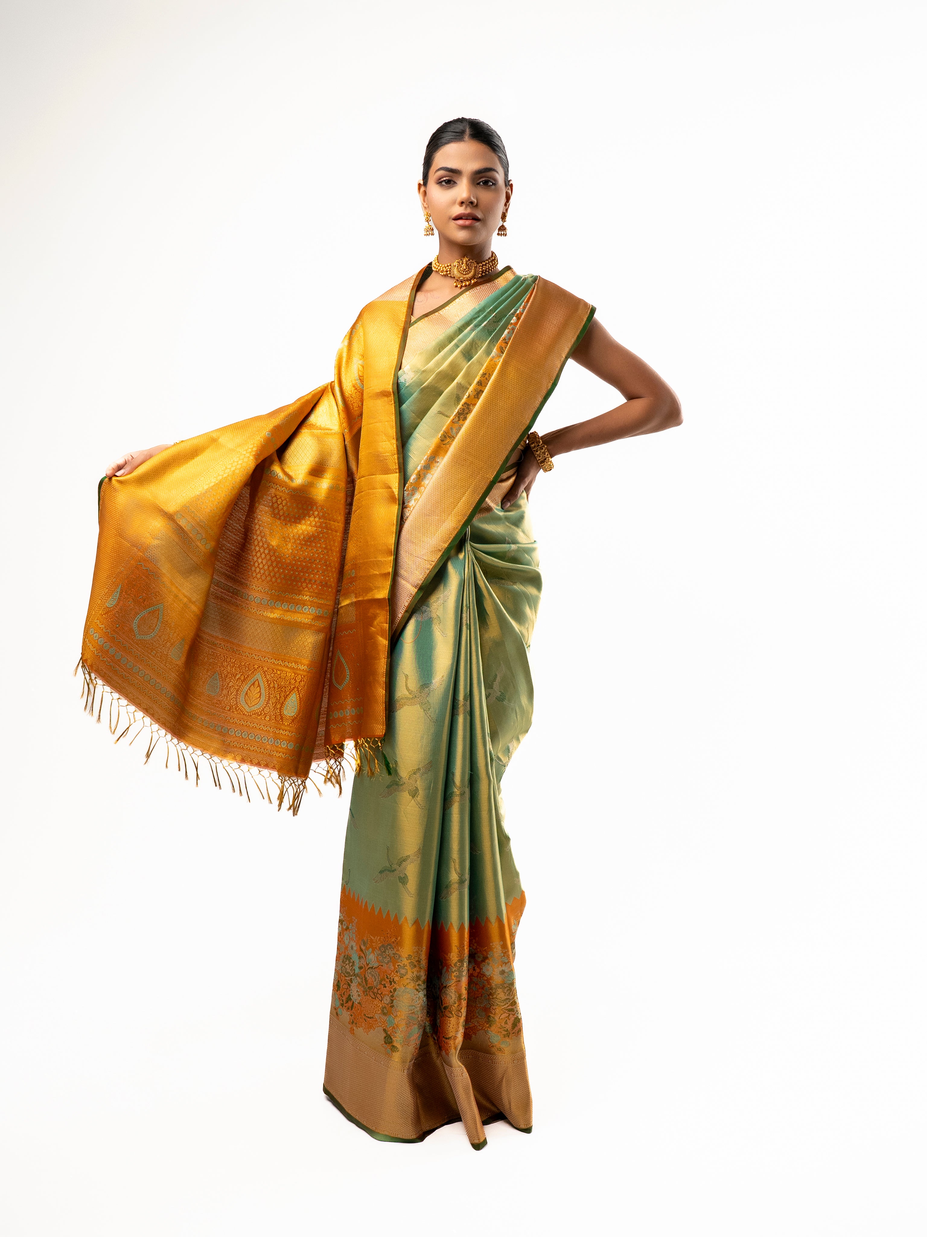 A hush of dawn over treetops: Avira drapes in sage-green with discreet flying-bird buttas scattered across the body. A sun-washed ochre pallu glows with paisley and dotted brocade, while the lower skirt blooms into a terracotta floral band that grounds the palette with temple-textile gravitas. The colour blocking is achieved through an exacting korvai join, and the birds are built on adai/jacquard cards, each punched to maintain wing and plume clarity across the drape.