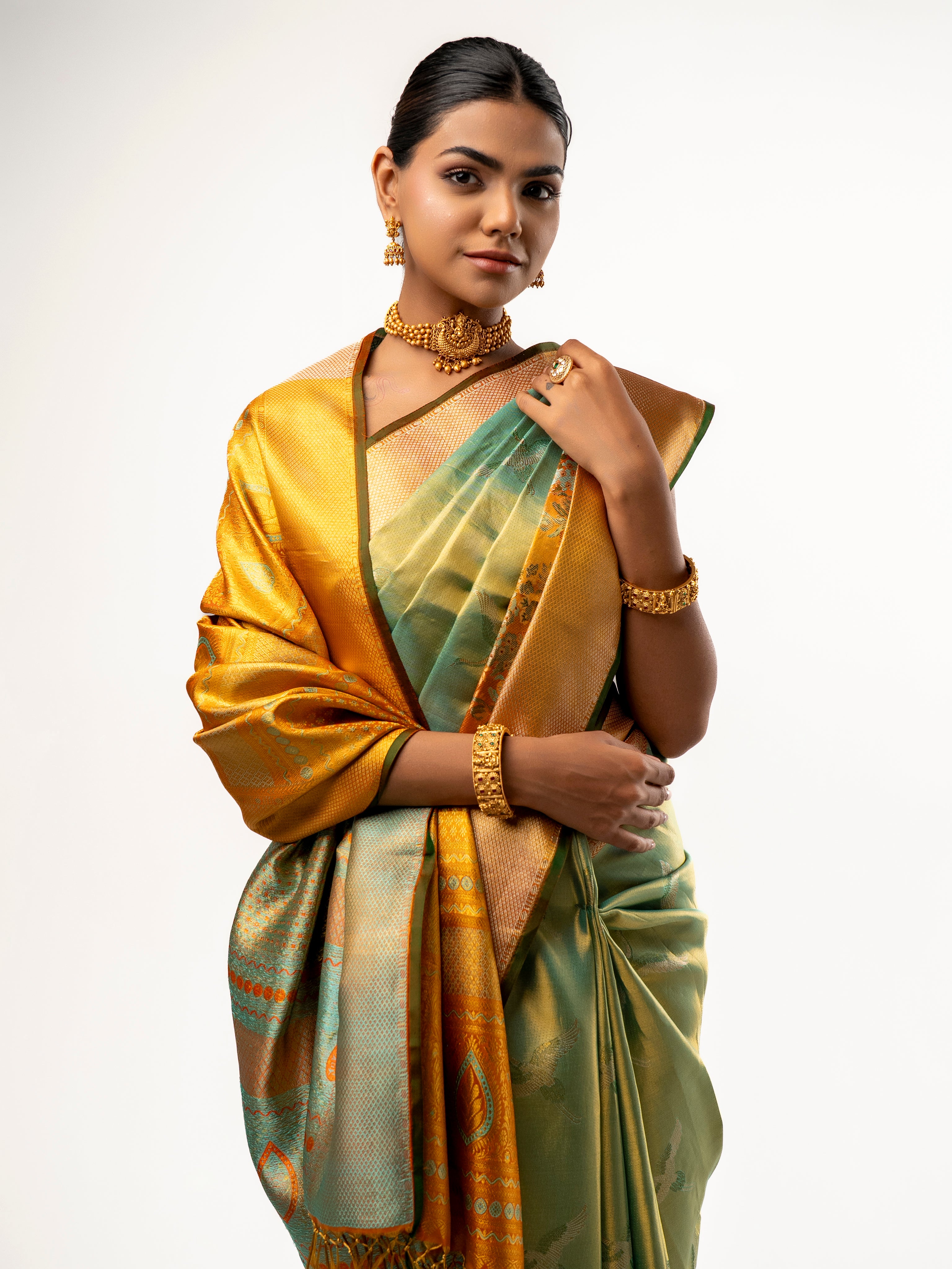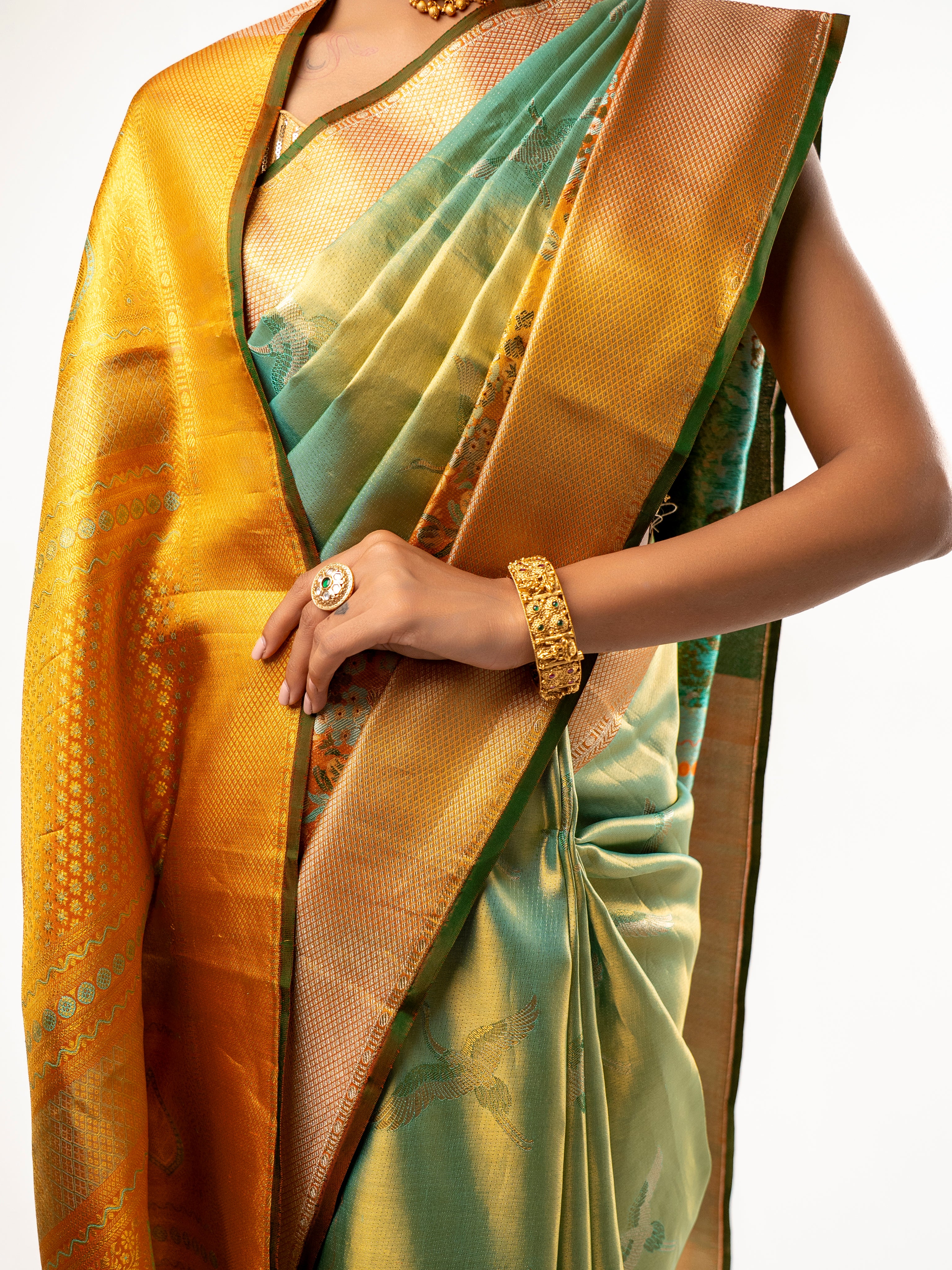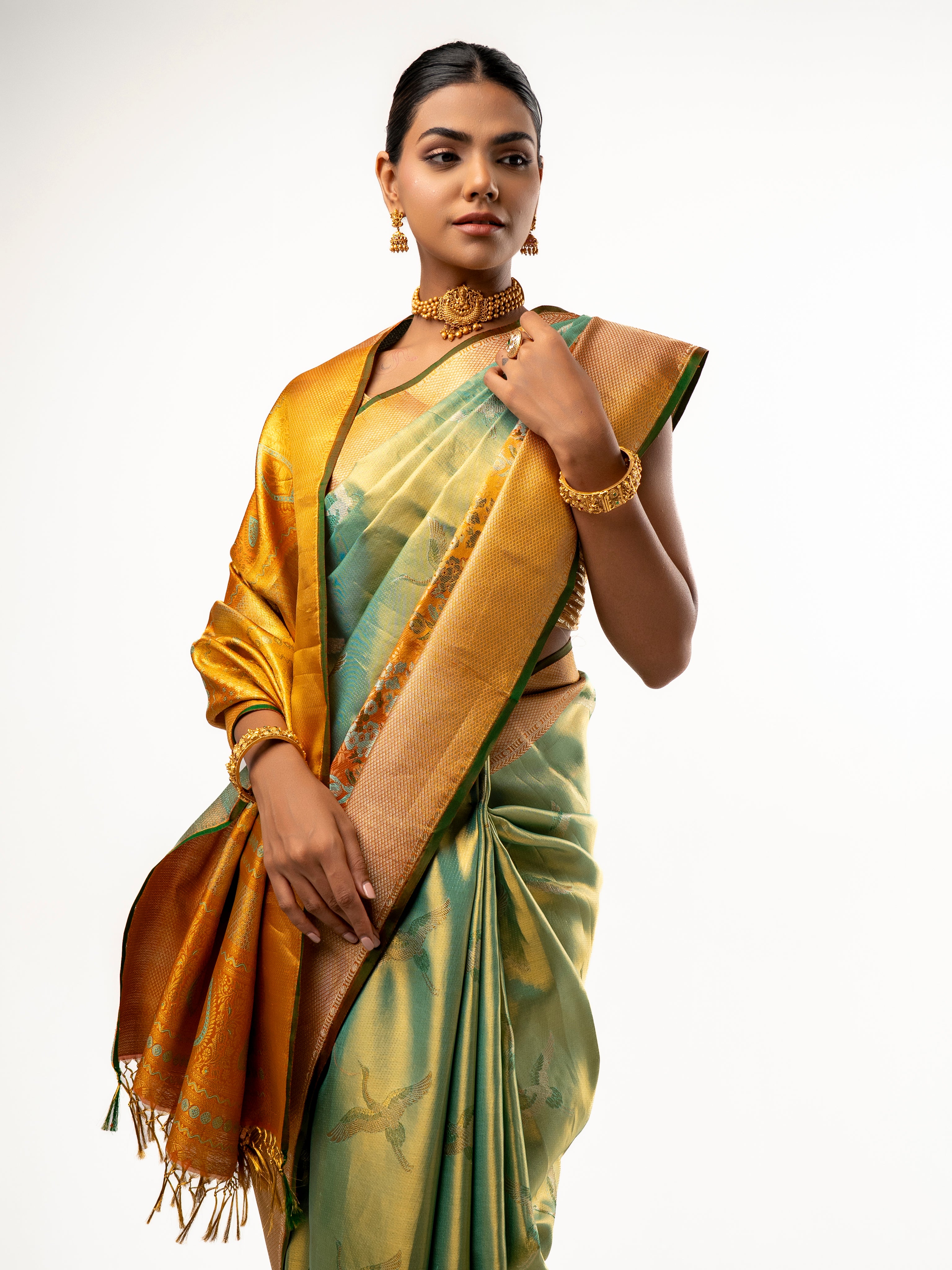 A hush of dawn over treetops: Avira drapes in sage-green with discreet flying-bird buttas scattered across the body. A sun-washed ochre pallu glows with paisley and dotted brocade, while the lower skirt blooms into a terracotta floral band that grounds the palette with temple-textile gravitas. The colour blocking is achieved through an exacting korvai join, and the birds are built on adai/jacquard cards, each punched to maintain wing and plume clarity across the drape.